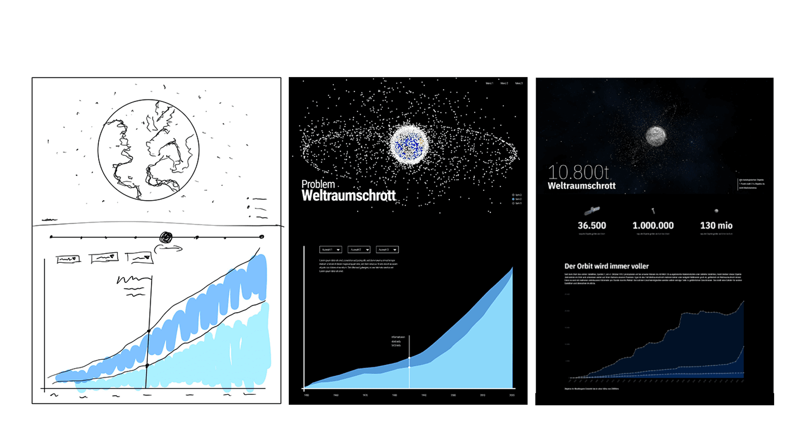 Um die Website von Anfang an so interessant und gleichzeitig Informativ wie möglich zu gestalten, war es wichtig, einen gelungenen Header zu gestalten. Hier kam bereits zu Beginn des Projekts und recht intuitiv die Idee einer Art Karte auf. Eine Karte schafft grundsätzlich immer eine gewisse Übersicht und kann auf einen Blick schnell viele Zusammenhänge intuitiv vermitteln. Damit konnte nun ein roter Faden durch den Aufbau der Website gezogen werden, um eine aufeinander aufbauende Geschichte zu erzählen. Nachdem man mithilfe der Karte einen ersten Überblick über die Menge des Weltraumschrott bekommen hat, wird dem Besucher anhand einer aktuellen Statistik und einer Datengrafik über den Anstieg von Weltraumschrott die Ausgangslage erklärt. Im „Hauptteil“ wird ein Blick auf die konkreten Probleme geworfen und auch ein einzelner Fall einer Kollision visualisiert. Am Ende wird auf eine mögliche Lösung eingegangen.